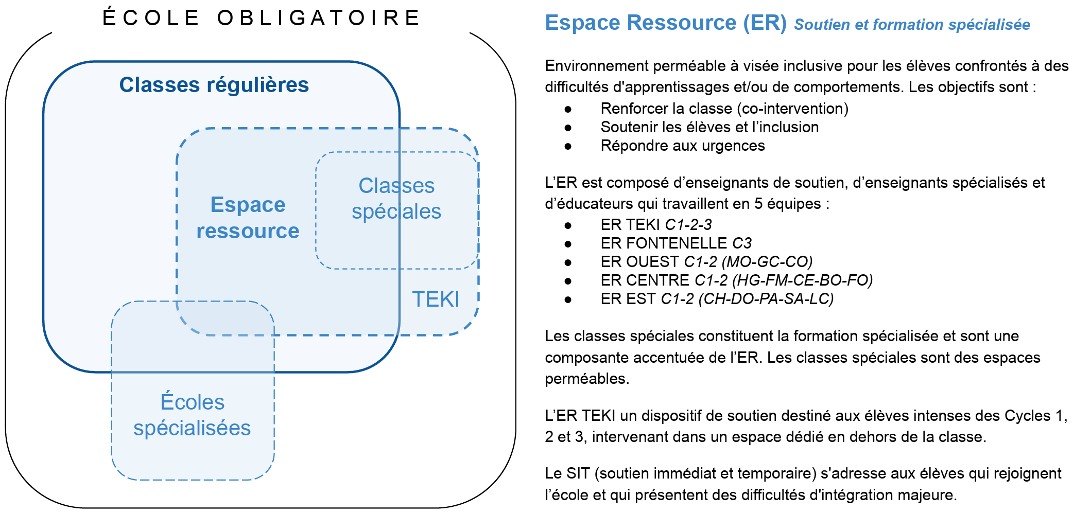 | Soutien à l’intégration (Cycles 1, 2 et 3) | Le soutien à l’intégration s’adresse aux élèves ayant des besoins éducatifs particuliers reconnus par l’Office de l’enseignement spécialisé (OES) et fréquentant notamment une école spécialisée à temps partiel. Il a pour but de favoriser l’intégration à temps partiel de l’élève dans une classe régulière |